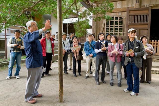 浄光明寺にて。マキの大木、阿弥陀三尊、土紋装飾の国重文・阿弥陀如来像などの説明。