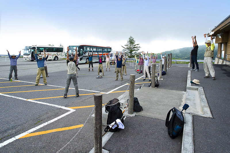 美ヶ原自然保護センタ−前でストレッチ