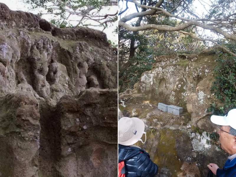 十王岩〜原型をとどめぬが観音菩薩・地蔵菩薩・閻魔大王の3体が見える。