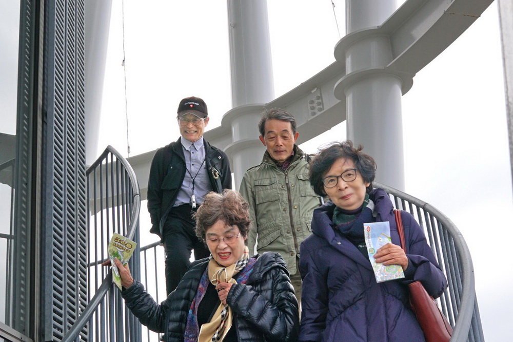 北西の横風も 高さも気にせず 外階段をトントン降りる 山女と山男。 半数がリフトに乗らず元気に外の螺旋階段を利用。