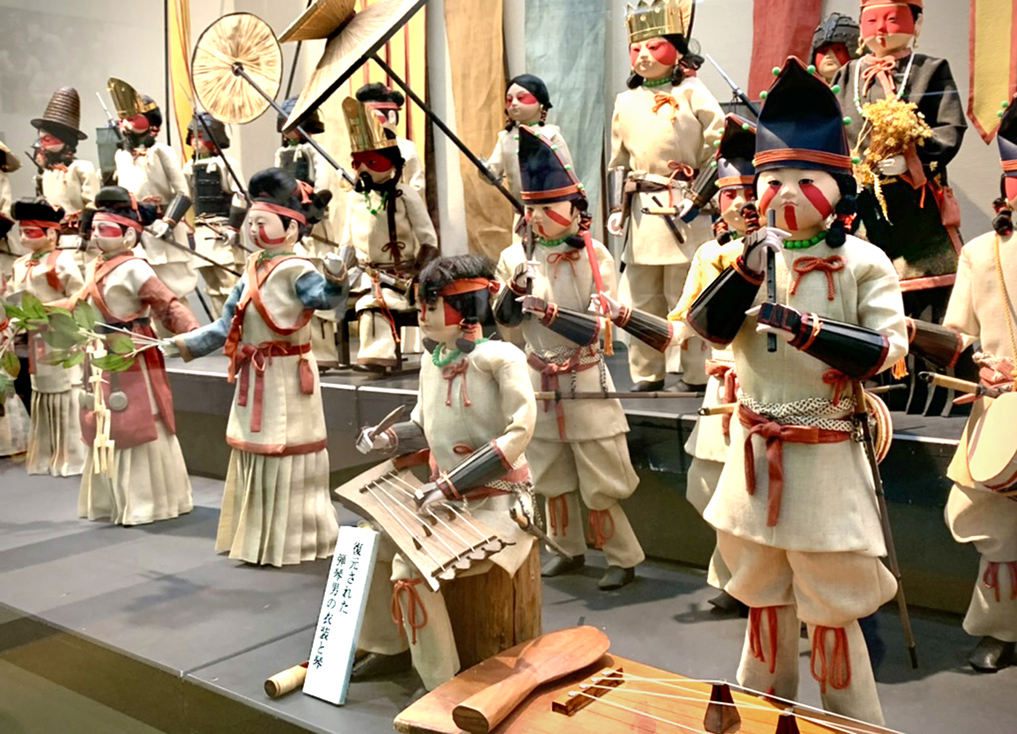 復元された入れ墨と古代衣装、例年11月には「はにわ祭り」で古代祭礼や巫女の舞、国造の武人行列などがある